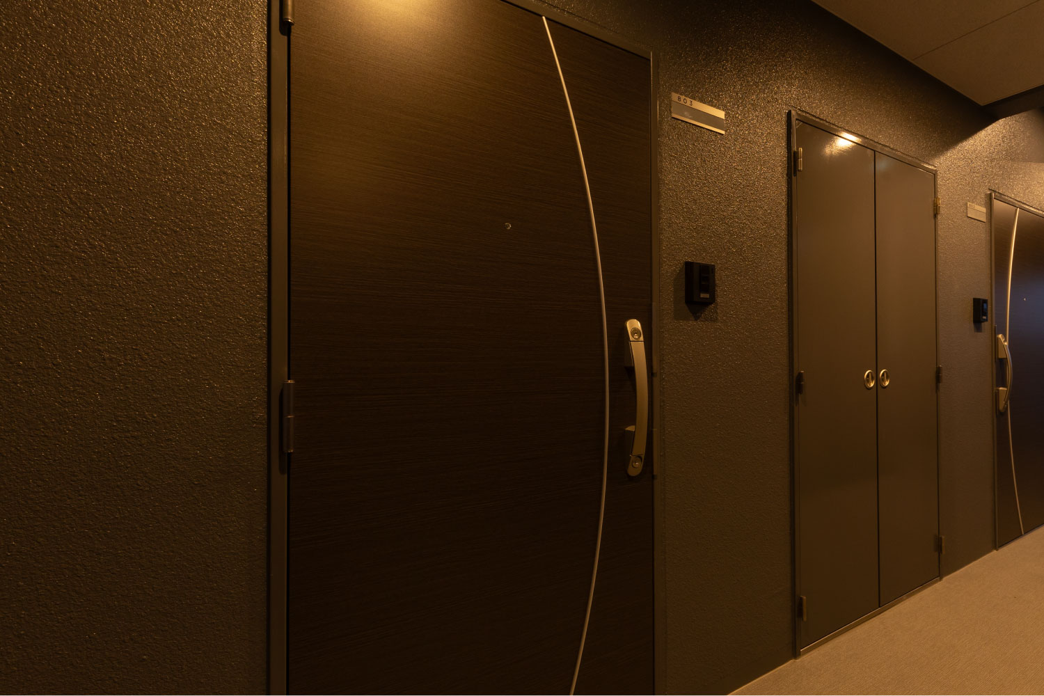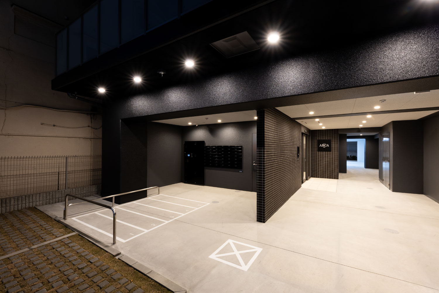 前面道路から続くエントランスアプローチには、帰宅される方を迎えるようにダウンライトを灯しました。