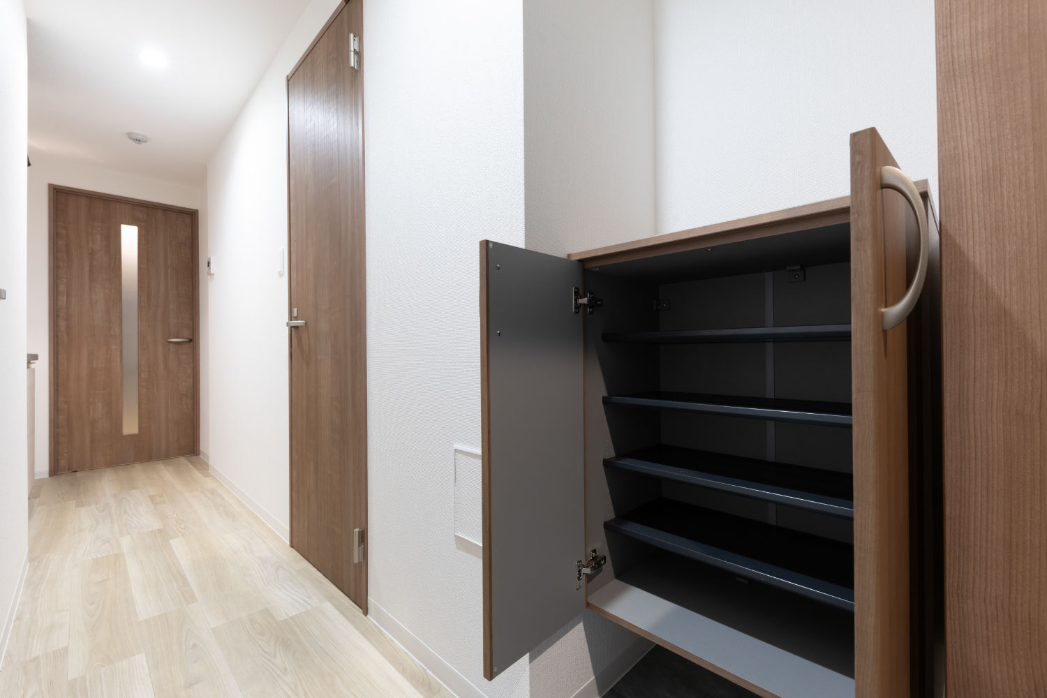 高さ調整できる可動棚付き。ロングブーツやレインシューズなど大きな靴もすっきりと収納できます。